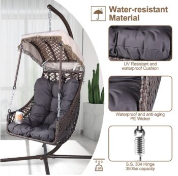 Swing Egg Chair With Stand Indoor And Outdoor Rattan Patio Basket Sling Chair With C-bracket, Patio Wicker Folding Sling Chair