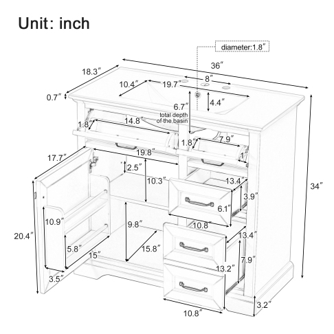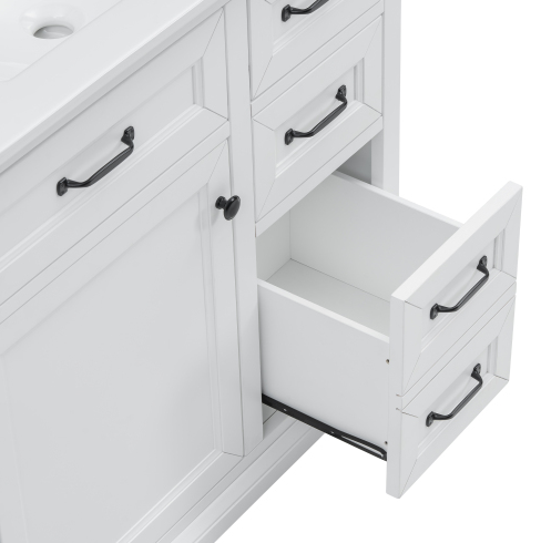 • Vanity with Cabinet and Drawers: Considering the humid environment in bathroom, this bathroom vanity has ample enclosed storage spaces: One cabinet with door shelf, two tip-out drawers and two drawers of different sizes with slide rail. You can put soaps, towels, shampoos, tissue paper and other bathroom essentials in it so to keep them away from dust. Moreover, the shelf in the cabinet can be adjusted into three heights.