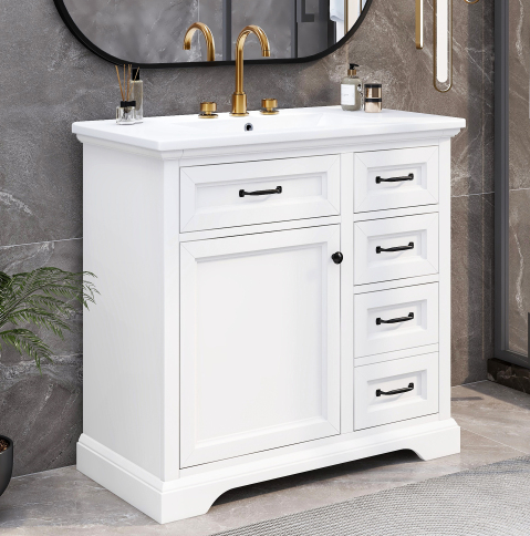 Product Name:36″ Bathroom Vanity with Sink, Ceramic Sink, 2 Tip-out Drawers, Soft Close Door Hinges, White
