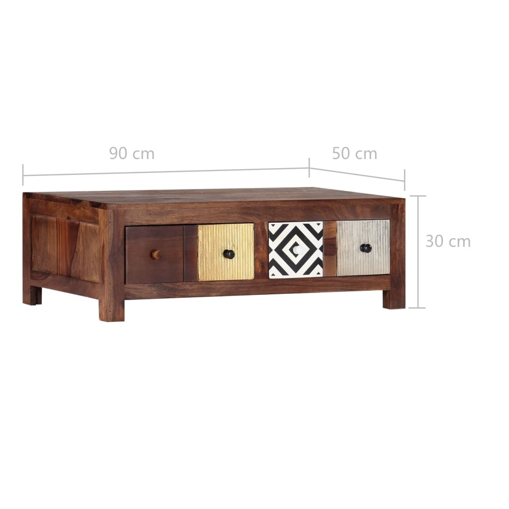 Features:Introduce an air of mid-century elegance to your home decor with our antique-style solid wooden coffee table! This coffee table is made of solid sheesham wood. Sheesham, also known as rosewood or palisander, is a tropical hardwood famous for its rich grain. This table has stable and secure top to place drinks, fruit baskets, decorative items, etc. The solid sheesham wood has been given a beautiful finish by polishing, painting and lacquering, making it exude a refined look. Two big drawers, whose front doors are decorated with different mixed pattern, one with screen and silver and the other with sheesham and gold, provide sufficient space to accommodate large household items. Additionally, the coffee table can also be used as a couch table, a living room table, a side table etc. Important note: The exquisite craftsmanship and the beautiful solid sheesham wood grains make every piece of furniture unique and slightly different from the next. The delivery is random, ensuring the exclusivity and individuality of your product.Material: Solid sheesham wood, solid acacia woodDimensions: 35.4″ x 19.7″ x 11.8″ (L x W x H)2 drawers with beautiful, decorative diamond patternPolished, painted, and lacqueredCalifornia Proposition 65WARNING: California’s Proposition 65Specifications:Material: Solid sheesham wood, solid acacia woodDimensions: 35.4″ x 19.7″ x 11.8″ (L x W x H)2 drawers with beautiful, decorative diamond patternPolished, painted, and lacqueredCalifornia Proposition 65WARNING: California’s Proposition 65