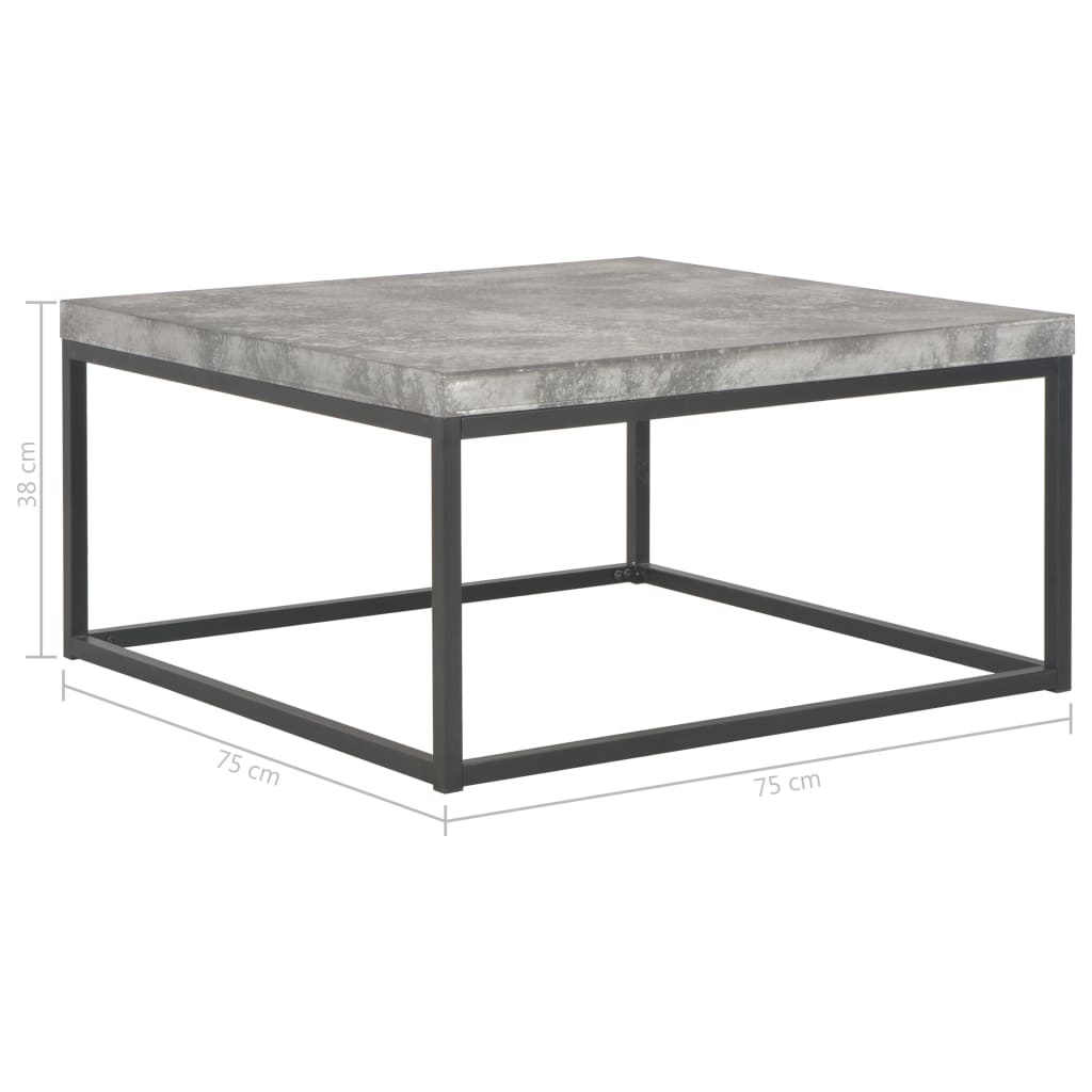 Features:This coffee table has a contemporary concrete look and will make a great addition to your living room. Thanks to the strong MDF tabletop and steel legs, our coffee table is very sturdy and durable. The tabletop is ideal for placing a tea or coffee set or displaying decorative objects such as photo frames and potted plants. The living room table is easy to assemble. Material: MDF + powder-coated steelWith a unique concrete lookOverall dimensions: 75 x 75 x 38 cm (L x W x H)Table top thickness: 3 cmSpecifications:Material: MDF + powder-coated steelWith a unique concrete lookOverall dimensions: 75 x 75 x 38 cm (L x W x H)Table top thickness: 3 cm