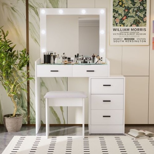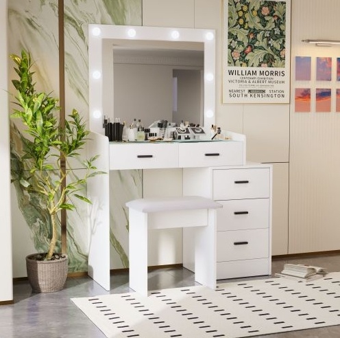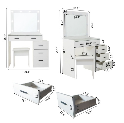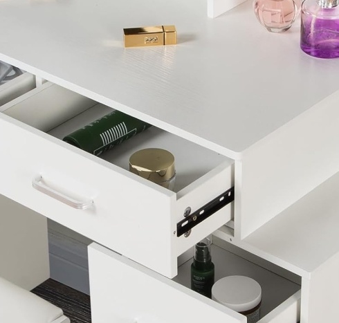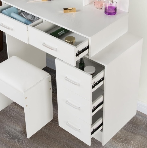 - Furniture with drawers: Multi drawer design with multiple compartments on the table for storing various cosmetics, making your makeup more organized and organized. There are 5 drawers under the table, which have a lot of storage space. 2 drawers designed with locks for storing valuable items, ensuring your privacy